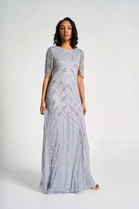 Women's Sexy V-Neck Short Sleeve Long Halter Prom Dress Heavy Beaded Hand Embellished Bodice Sequined for Parties Evening Events