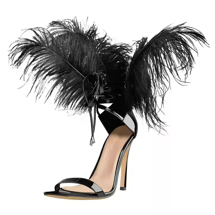Custom Women Sandal Ankle Strap Open Toe Feather Black Lace up Thin Stiletto Heel Sandals